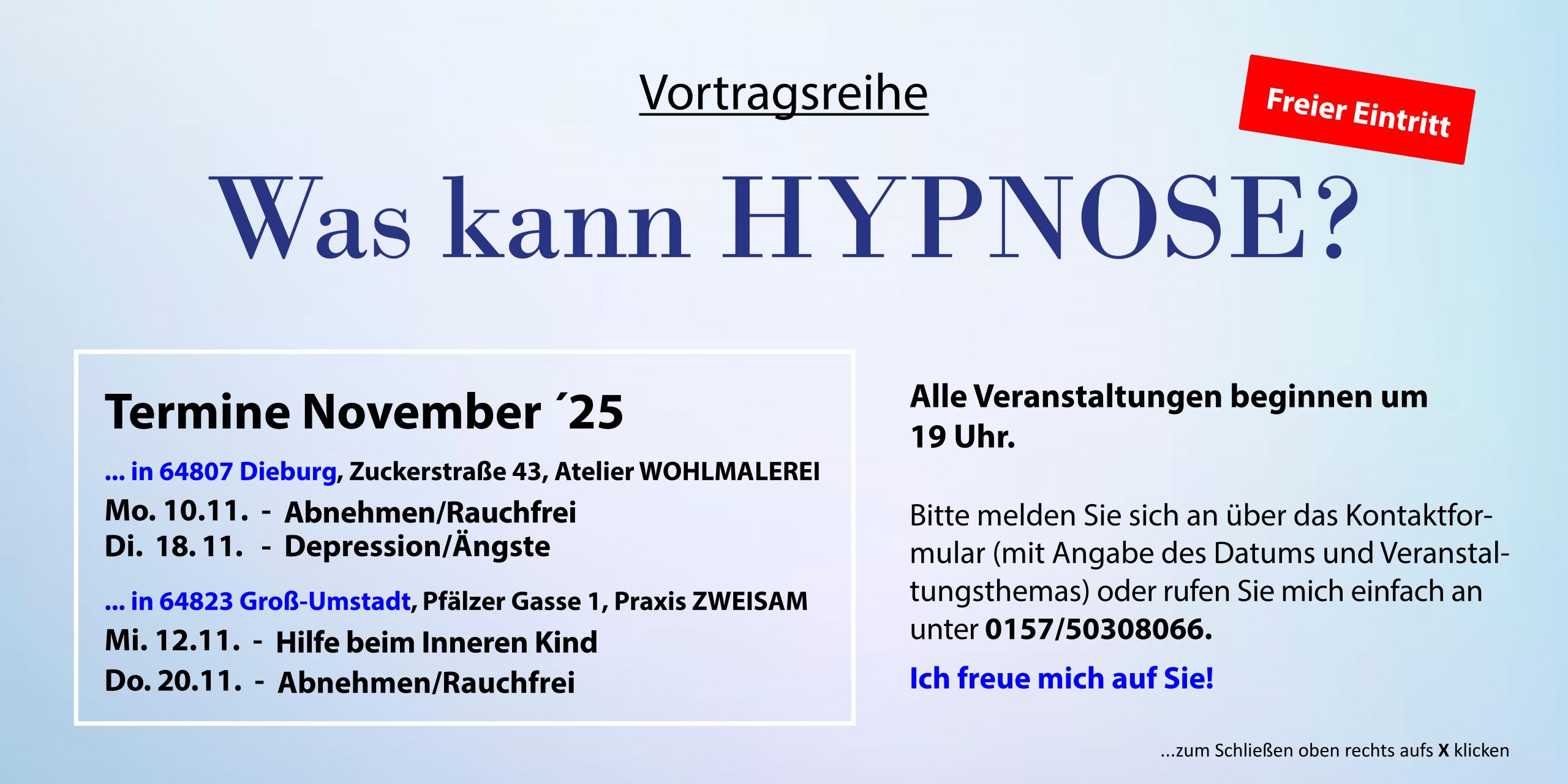 Wenn Sie sich für die uralte und doch hochaktuelle und inzwischen bestens erforschte Methode der HYPNOSE interessieren, biete ich Ihnen an, einen meiner Vorträge in Dieburg oder Groß-Umstadt zu besuchen. An verschiedenen Themenabenden beleuchte ich die Möglichkeiten der Hypnose im Allgemeinen und ihre Wirkung auf spezifische Verhaltensweisen und Erkrankungen.
